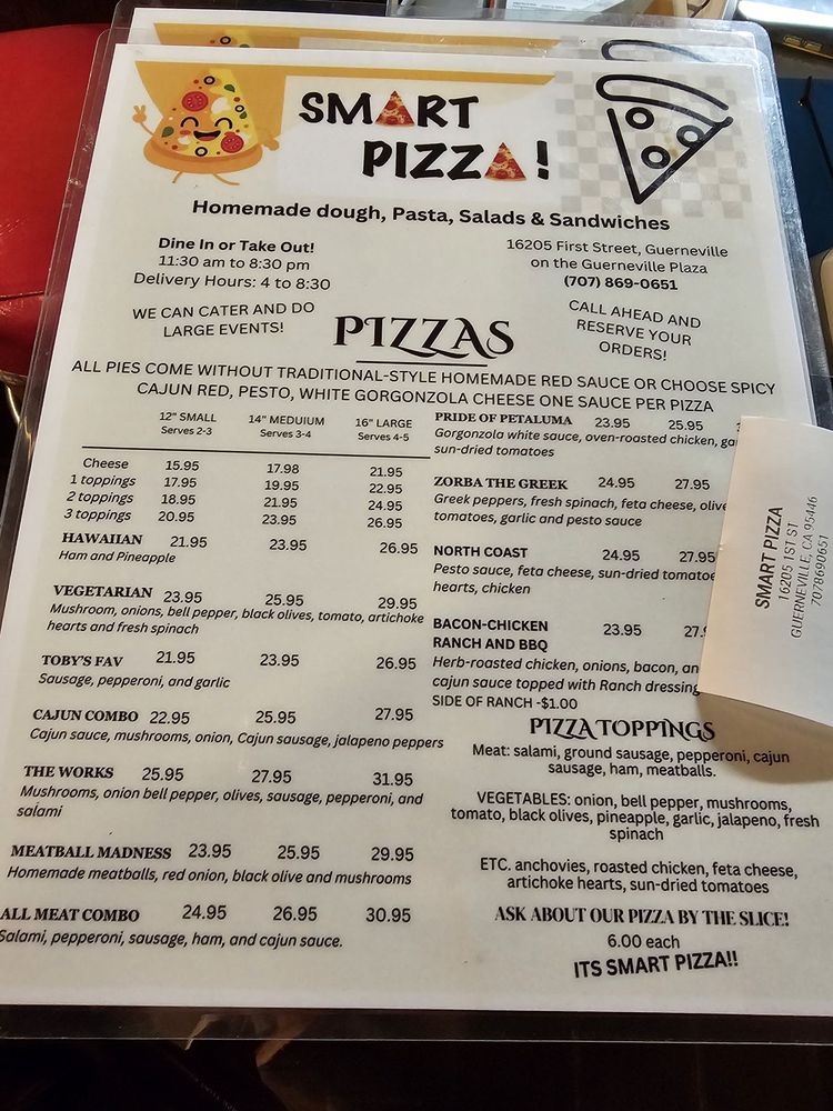 Smart Pizza, located in Guerneville, CA, offers a diverse menu of delicious pizza options with an emphasis on fresh ingredients and high-quality crusts. Customers rave about the pesto chicken, plain cheese, and pepperoni pizzas, highlighting the flavorful toppings and excellent crust. The cozy, old-school ambiance adds to the dining experience, with eclectic decor and a welcoming staff. With a wide selection of draft beers and a commitment to customer satisfaction, Smart Pizza is a must-visit spot for pizza lovers in the area. Whether you're stopping in for a quick snack or a leisurely dinner with friends and family, Smart Pizza delivers on taste and service. Don't miss out on their tasty pizza bread and friendly atmosphere—it's a hidden gem waiting to be discovered.